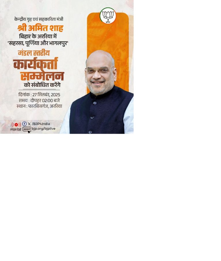 नई दिल्ली, 27 सितंबर। केन्द्रीय गृह एवं सहकारितामंत्री अमित शाह आज बिहार प्रवास के...