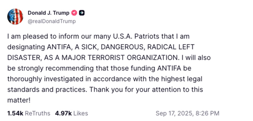 फॉक्स न्यूज की रिपोर्ट के अनुसार, राष्ट्रपति ने घोषणा में कहा, “एंटीफा भयानक है। यह विरोध प्रदर्शन नहीं हैं। यह अपराध है। वे पेशेवर आंदोलनकारी हैं। उन्हें जेल में डाल देना चाहिए। वे इस देश के साथ जो कर रहे हैं, वह वाकई विध्वंसकारी है।” ट्रंप ने 10 सितंबर को टर्निंग पॉइंट यूएसए के संस्थापक चार्ली किर्क के कथित हत्यारे टायलर रॉबिन्सन को “कट्टरपंथी” अति-वामपंथी सक्रियता से जोड़ा है।